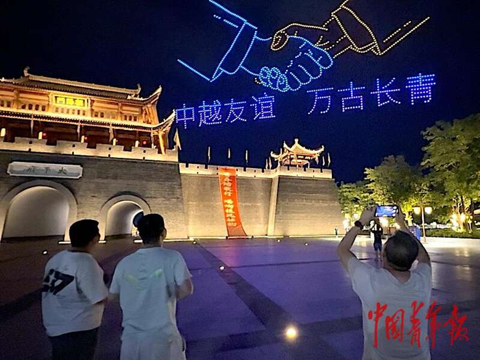 5月20日,广西崇左太平古城街区,无人机表演打出“中越友谊 万古长青”的字样,中越青年代表驻足观看、拍照留念。马子倩/摄来源:中国青年报客户端