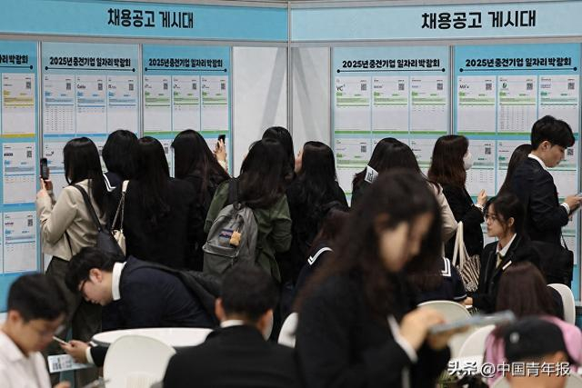 当地时间2025年4月23日,韩国首尔,江南区韩国国际会展中心(COEX),2025年中型骨干企业就业博览会举行,各用人单位展台前人流如织。视觉中国 资料图