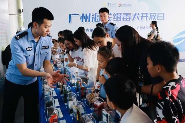 工作人员讲解禁毒知识并介绍广州海关缉私犬队情况。池兆恩/摄目前,广州海关缉私犬队现驯养有4条缉毒犬、1条缉枪犬、1条濒危物种搜查犬和1条防暴犬,主要承担广州海关关区旅检现场、邮递物品监管现场和货运现场的口岸巡查职能,严防毒品、枪支、濒危野生动物制品等走私入境。