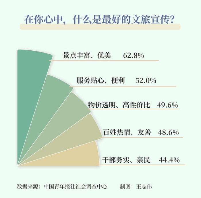 调查显示,对于受访者心中最好的文旅宣传,62.8%的受访者认为是景点丰富优美,服务贴心、便利排在第二位,获选率为52.0%,49.6%的受访者认为是物价透明、高性价比,48.6%的受访者认为是百姓热情、友善。