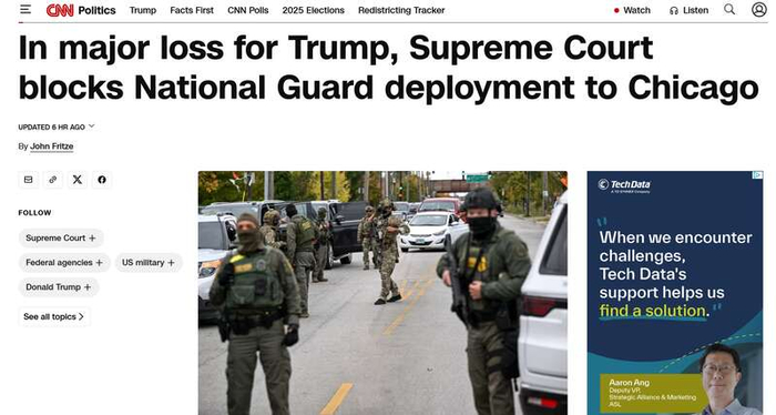 美国有线电视新闻网报道截图中国青年报客户端北京12月24日电 (中青报·中青网记者 张昊天)一纸出人意料的判决结果,让特朗普政府在美国国内部署军队的计划面临前所未有的阻力。当地时间12月23日,美国最高法院经两个月审理,以6比3的投票结果作出裁决,认定白宫派遣国民警卫队前往芝加哥“协助执法”的行动缺乏正当依据。外媒认为,部分本应支持特朗普的保守派法官“反戈一击”,或将影响美军进驻更多城市的计划。