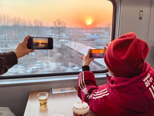 12月27日,C125次列车,王萍用手机拍下窗外的日出,她说每次坐这班列车都会用手机记录下美好的朝阳瞬间。中青报·中青网记者 陈思阳/摄