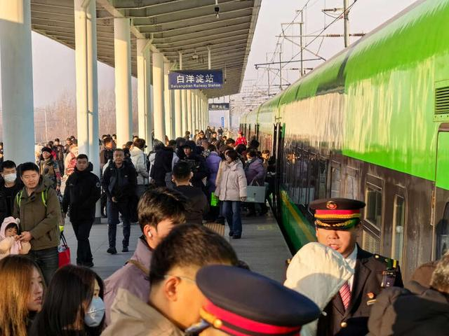 12月27日,白洋淀站,大批旅客排队上车。中青报·中青网记者 陈思阳/摄津保铁路也是首条横贯雄安新区的铁路线路。自2017年雄安新区设立以来,该线路开行北京至雄安、天津至雄安等多趟列车,并率先实现京津冀进港高铁全覆盖。白沟站、白洋淀站客流量显著增长,十年间分别累计发送旅客436万人次和718万人次,2025年发送量较2016年增幅分别达400%和719%。