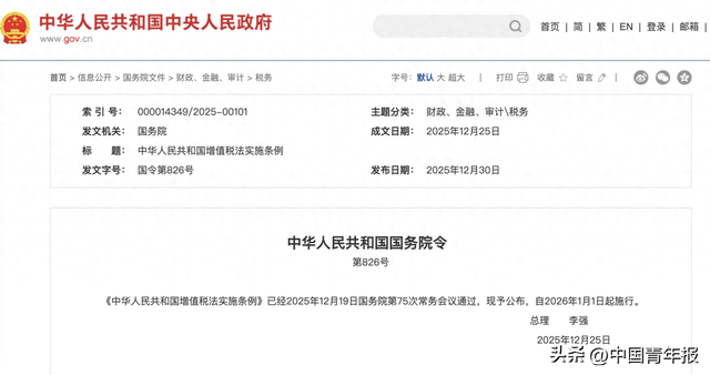 国务院总理李强日前签署国务院令,公布《中华人民共和国增值税法实施条例》(以下简称《条例》),自2026年1月1日起施行。《条例》旨在贯彻落实《中华人民共和国增值税法》,共6章54条,主要规定了以下内容。