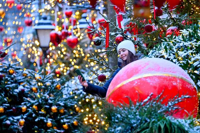 2025年12月28日,俄罗斯莫斯科,新年准备工作完成后,人们在街头游览。广场和公园被灯光点亮,并装饰着新年饰品。视觉中国供图
