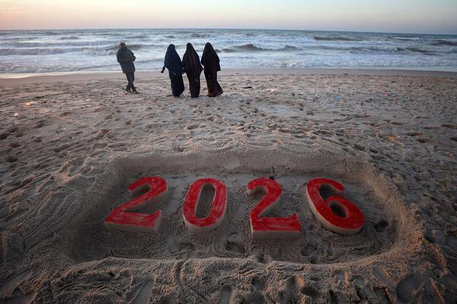 2025年12月31日,巴勒斯坦加沙城,民众在海滩上走过一个写有“2026”字样的沙雕,迎接2025年最后一个日落。视觉中国供图