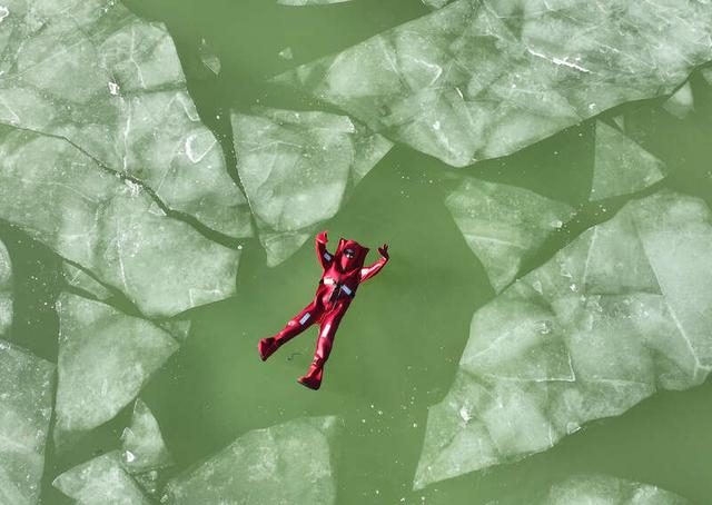 1月1日,宁夏银川,阅海湾景区,游客体验湖面冰浮项目。现场,人们穿戴鲜艳的红色浮力装备,悠然漂浮于澄澈冰凉的湖面之上,在冬日暖阳中静享宁静湖景,以这样一种轻松而特别的方式,度过元旦假期。视觉中国供图