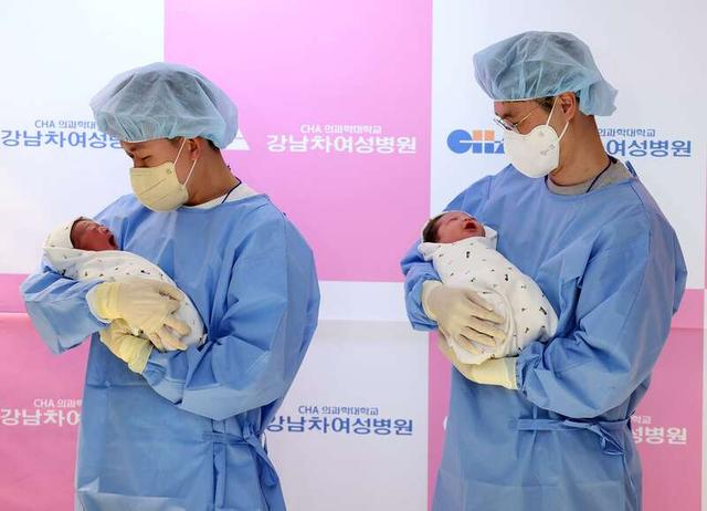 1月1日,韩国首尔,一家医疗中心内,两名父亲抱着他们的新生儿,在元旦迎接新生命。视觉中国供图