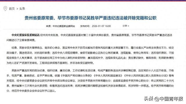 经中共中央批准,中央纪委国家监委对第二十届中央候补委员,贵州省委原常委、毕节市委原书记吴胜华严重违纪违法问题进行了立案审查调查。