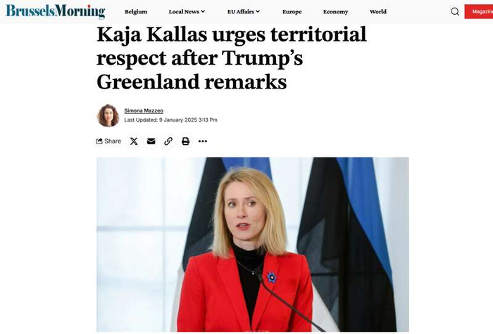 比利时“Brussels Morning”新闻网报道截图中国青年报客户端北京1月9日电(中青报·中青网记者 王梓)据比利时“Brussels Morning”新闻网1月9日报道,欧盟外交与安全政策高级代表卡拉斯再次强调,格陵兰岛的主权必须得到尊重。