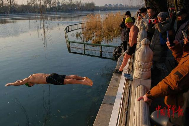1月8日,北京什刹海,一名冬泳爱好者跃入水中,引得不少游客围观。中青报·中青网记者 田嘉硕/摄