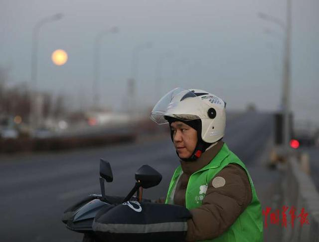 1月3日,北京东四环外,一位外卖小哥在路口等红灯,一轮圆月从远处缓缓升起。当日,2026年首个“超级月亮”登场。中青报·中青网记者 陈剑/摄