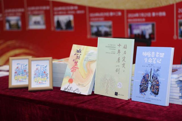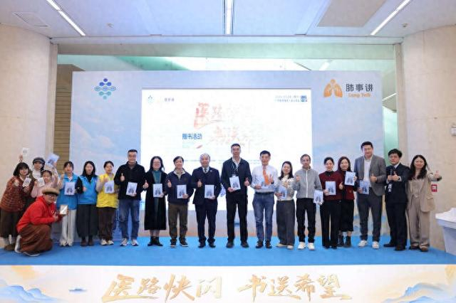《肺癌患者的生命笔记》系列书籍赠书仪式现场。主办方供图该书主编、广东省人民医院肿瘤医院肺内一科主任医师杨衿记教授代表创作团队捐赠图书,系列书籍包括:《肺癌患者的生命笔记》《怒放的生命》和《钻石突变,十年磨一剑》。