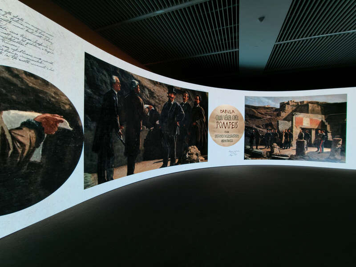 展览现场。主办方供图展览融合前沿科技与严谨学术,特别设置3个沉浸式展项,其中包括部分从未对外开放区域的珍贵镜头。观众不仅能通过多媒体装置“走进”典型的希腊化豪宅——农牧神之家,欣赏其精美的地面与天花板装饰,还能通过虚拟重建,感受庞贝300年的发掘全过程,亦可看到充满活力的庞贝城市,理解其与罗马之间复杂的关系。现场大屏采用类纸LED技术呈现,包括长度达16米、面积超64平方米的环形巨幕。