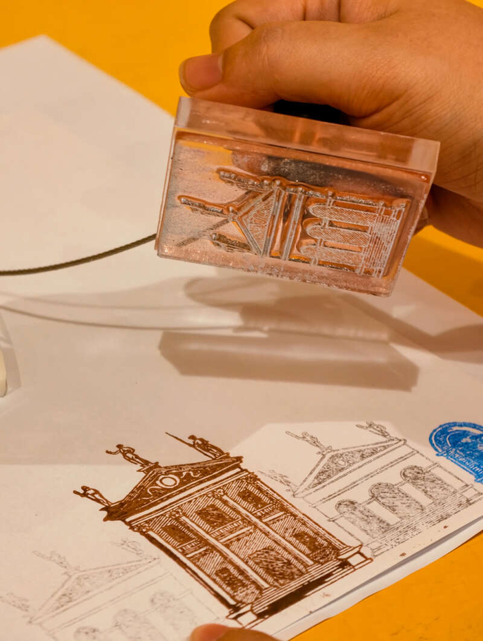 展览设置了帕拉第奥建筑元素印章区,提供多种代表性元素印章。观众可选取心仪的元素进行盖印,通过自由组合,完成一份独属于自己的建筑“设计图”。