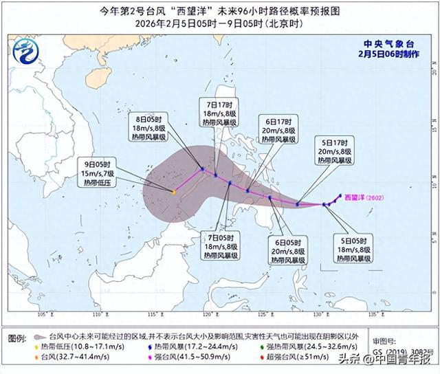 中国天气网讯 今年第2号台风“西望洋”(热带风暴级)的中心今天(5日)早晨5点钟位于菲律宾马尼拉东南方向约1240公里的洋面上,就是北纬8.0度、东经130.2度,中心附近最大风力有8级(18米/秒),中心最低气压为998百帕,七级风圈半径为180-320公里。