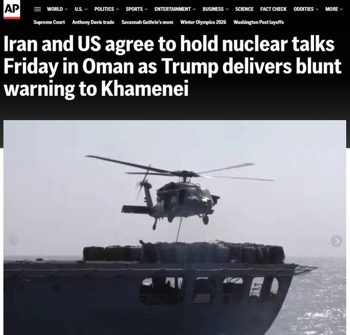 美联社报道截图中国青年报客户端讯(中青报·中青网记者 王梓)美国与伊朗之间的紧张局势持续升温。当地时间2月6日上午,美伊核谈判将在阿曼首都马斯喀特举行。谈判前夕,两国分别发出强硬信号。