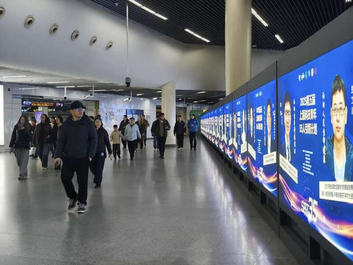上海地铁人民广场站展示“上海科技青年35人引领计划”。图片来源:半月谈这些青年科技人才在量子探测、生命健康、人工智能、绿色环保等前沿领域都取得了显著成就,具有较大的发展潜力,理应“破圈”,让更多人看见、被更多人支持。