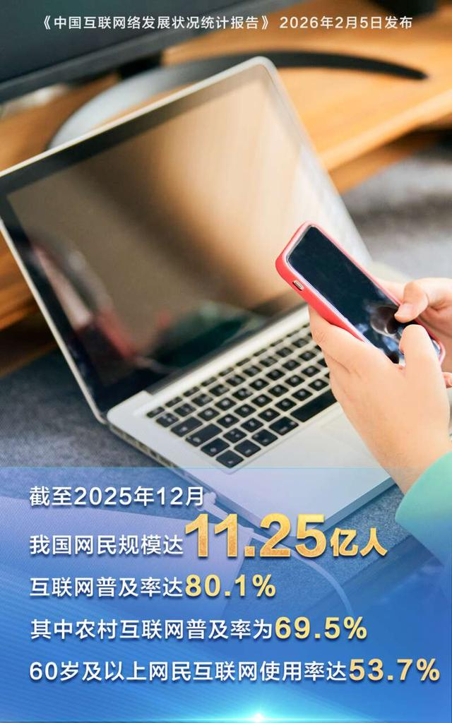 第57次《中国互联网络发展状况统计报告》5日发布。截至2025年12月,我国网民规模达11.25亿人,互联网普及率突破80%。