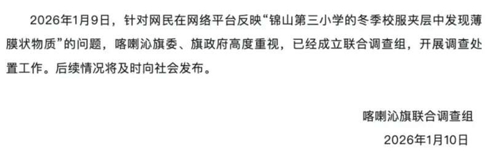 针对网传“内蒙古赤峰锦山第三小学的冬季校服夹层中发现薄膜状物质”问题,当地已经成立联合调查组,开展调查处置工作。