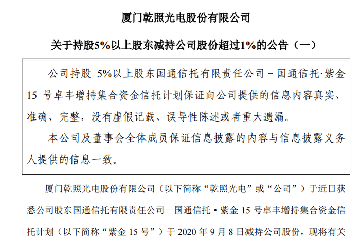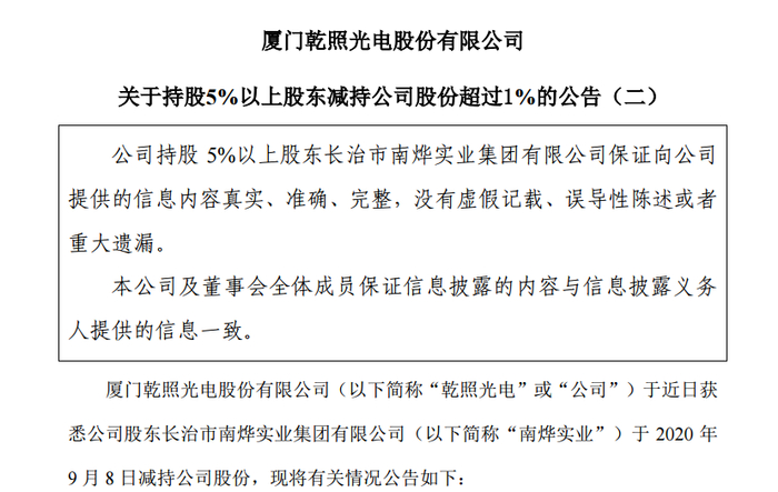 值得注意的是,乾照光电还于当晚披露了两则减持公告。公司的两位股东在高位合计减持了6%股权,套现金额约为5.35亿元。
