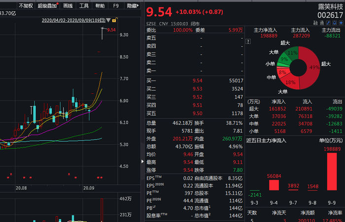 但股价并未熄火。截至收盘,露笑科技股价四连板,报9.54元,动态市盈率397倍。公司亦是昨日该板块内唯一涨停的个股。
