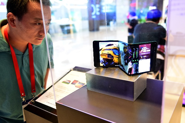 6月17日,参观者在在安徽合肥举办的2021世界显示产业大会上观看一款可折叠显示屏。新华社。