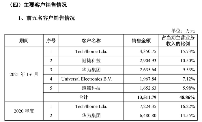 其中,辰奕智能与华为技术有限公司在2017年建立合作关系,与华为终端有限公司2018年建立合作关系,主要向公司采购蓝牙遥控器,华为集团是2020年第二大客户。