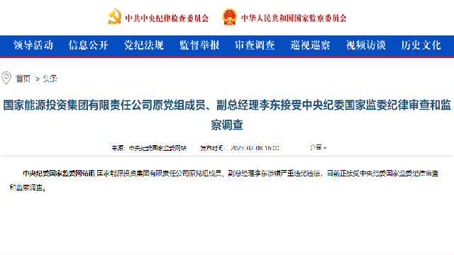2月8日,中央纪委国家监委网站发布消息称,国家能源投资集团有限责任公司(下称“国家能源集团”)原党组成员、副总经理李东涉嫌严重违纪违法,目前正接受中央纪委国家监委纪律审查和监察调查。