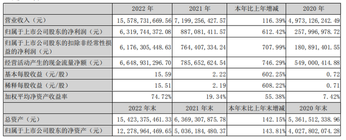 永兴材料3月20日晚间披露年报,2022年公司实现营业收入155.79亿元,同比增长116.39%;归母净利润63.2亿元,同比增长612.42%;扣除非经常性损益后净利润61.76亿元,同比增长707.99%;基本每股收益15.59元。