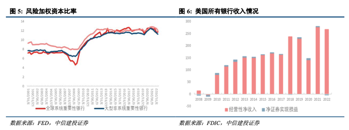 资本充足率有所恶化,但总体仍处在合理区间。风险加权资本比率自2021年末的高点持续下滑,大型银行资本缓冲压力有所上升。盈利情况较2021年有所下滑,但总体仍处在历史较高位,强劲的盈利能力有利于提取留存收益,增加资本金,强化银行韧性。