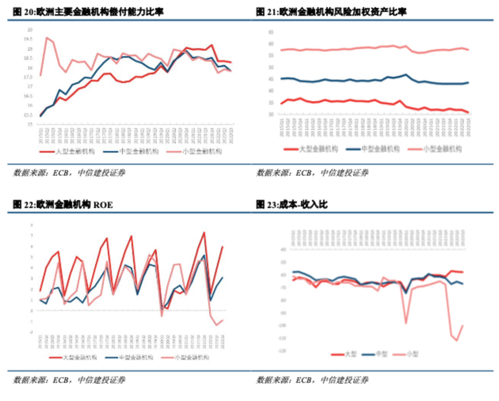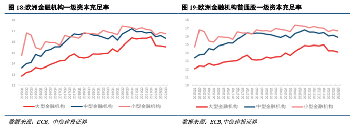 资本充足率有所下滑,但仍在监管适度区间。由于金融危机后的监管改革,过去10年,欧洲银行业的总体稳健状况显著改善,2015年以来,不良贷款率从7%以上下降到3%以下,而普通股一级资本的平均比率增加了2%以上。2022年以来,欧洲金融体系特别是小型金融机构一级资本充足率出现下滑,尽管仍处于历史相对较高位置,但反映出银行盈利下行和风险资产上升的情况。
