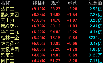 截至发稿,达仁堂涨超9%,昆药集团涨超8%,天士力、康缘药业、华润三九等跟涨。