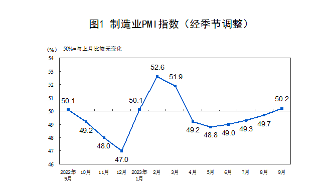 国家统计局9月30日发布的数据显示,9月份制造业采购经理指数、非制造业商务活动指数和综合PMI产出指数分别为50.2%、51.7%和52.0%,比上月上升0.5、0.7和0.7个百分点,三大指数均位于扩张区间,我国经济景气水平有所回升。