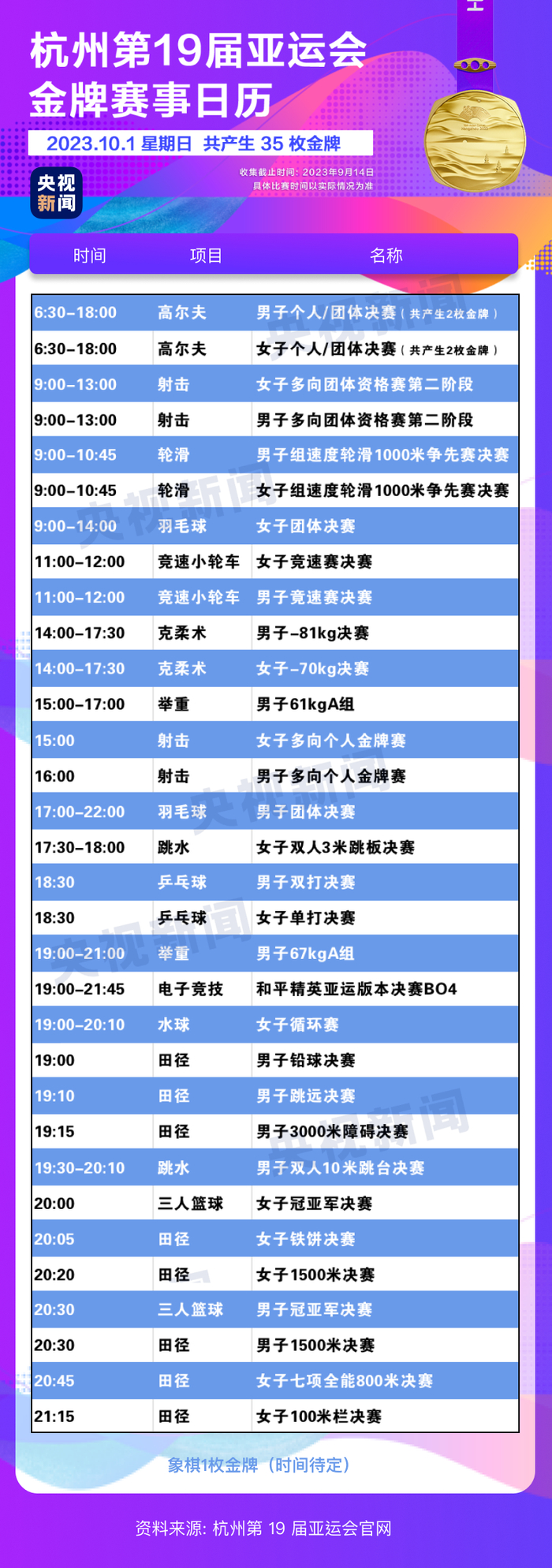 9月30日,杭州第19届亚运会共产生25枚金牌,中国代表团夺得了其中的9枚。