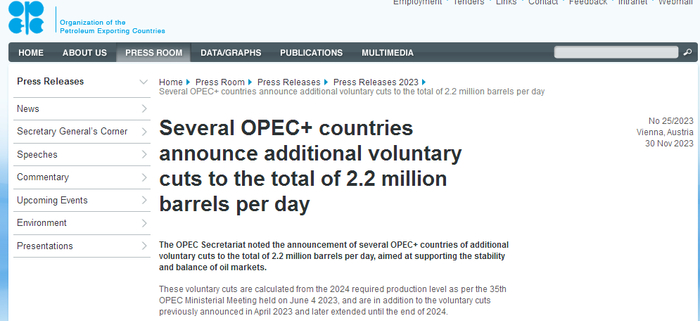 会议开始前,OPEC+突然传出各国开始讨论加码减产的计划。最终各方在短时间内达成了一致,同意在明年一季度自愿减产220万桶/日。其中,沙特与俄罗斯的减产延期不变,剩余的90万桶/日额度由六个成员国分担,其中伊拉克减产22万桶/日,阿联酋减产16.3万桶/日,科威特减产13.5万桶/日,哈萨克斯坦、阿尔及利亚和阿曼减产规模在4万~8万桶/日。