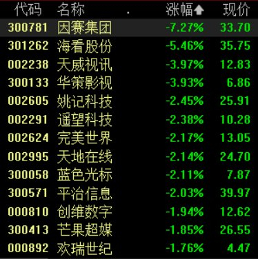 截至发稿,因赛集团跌超7%,海看股份跌超5%,天威视讯、华策影视、姚记科技等跌幅居前。
