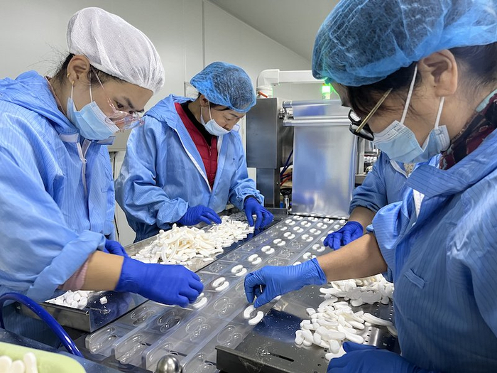 地处山东半岛东南部的小城胶州,12月的初冬里,下午5点多天就黑了,胶州路上的一家化妆品生产车间里,却是一片热火朝天的景象,这里的工人们正在抓紧赶制冻干精华眼膜订单,这类新型的眼膜产品,吸引了来自广州部分化妆品生产企业的上门考察。