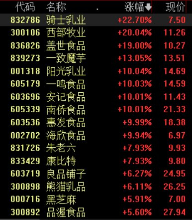 截至发稿,西部牧业、阳光乳业、一鸣食品等7股涨停,良品铺子、熊猫乳品等多股跟涨。