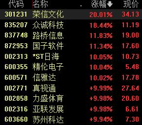 12月7日,人工智能概念股涨幅居前,截至发稿,荣信文化20%涨停,众诚科技大涨18%,路桥信息、国子软件涨超10%,信雅达、真视通、力盛体育等多股涨停。