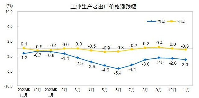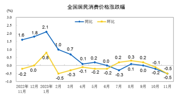 国家统计局9日发布的数据显示,11月份,全国居民消费价格指数(CPI)同比下降0.5%,降幅比上月扩大0.3个百分点;环比下降0.5%。全国工业生产者出厂价格指数(PPI)同比下降3%,降幅比上月扩大0.4个百分点;环比由上月持平转为下降0.3%。