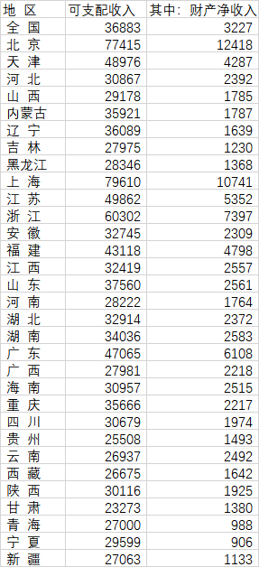 去年有7个省份的人均财产净收入超过全国平均水平,分别是北京、上海、浙江、广东、江苏、福建和天津。