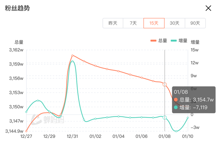 与“与辉同行”直播间粉丝量与销售额大涨相对应的,是东方甄选直播间的增速放缓。蝉妈妈数据显示,近十天时间内,东方甄选直播间粉丝总量持续下滑,自2023年12月31日的3160.8万跌至目前的3150.1万,销售额也从2023年12月18日的过1亿元跌至9日的1000万元至2500万元范围。