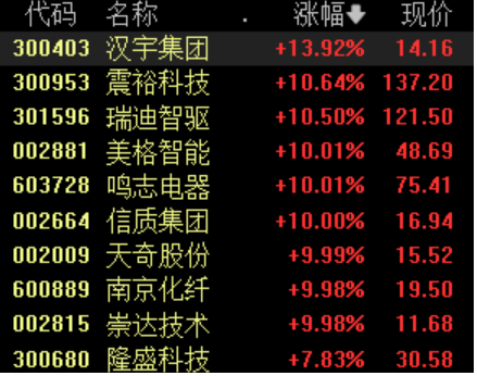 美格智能涨停,瑞迪智驱涨超9%,鸣志电器、领益智造、胜宏科技跟涨。