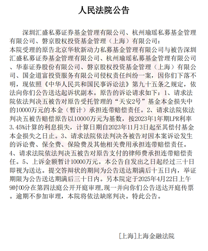 上海金融法院公告显示,北京华软新动力私募基金管理有限公司(下称“华软新动力”)以侵权责任纠纷为由,将深圳汇盛私募证券基金管理有限公司(下称“深圳汇盛”)、杭州瑜瑶私募基金管理有限公司(下称“杭州瑜瑶”)、磐京股权投资基金管理(上海)有限公司(下称“磐京投资”)、华泰证券股份有限公司(下称“华泰证券”)、国金道富投资服务有限公司(下称“国金道富”)这5家机构诉至法庭,该诉讼案将于4月22日开庭。
