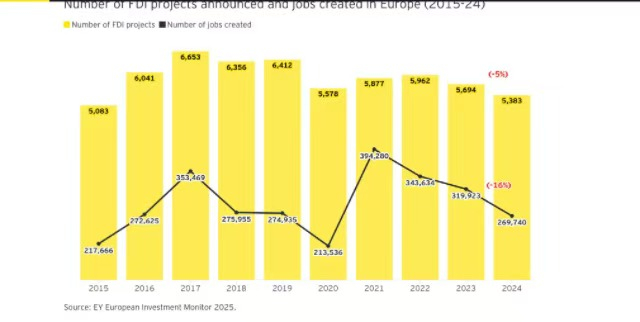 调查显示,2024年欧洲制造业FDI下降9%,达到了2020年以来新项目的最低水平。新的新建项目减少了20%,制造业创造的就业岗位减少了25%。“这是一个令人担忧的问题,因为新建项目创造的就业机会通常是扩建项目的两倍。”报告写道。