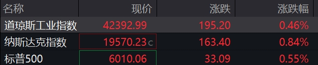 道指涨0.46%,纳指涨0.84%,标普500指数涨0.55%。