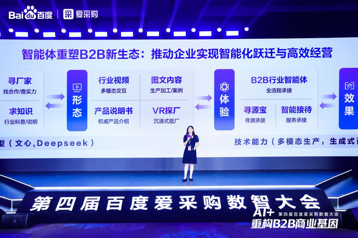 百度爱采购副总经理崔燕在《AI重塑B2B新范式——从场景到效果的智能进化之路》演讲中表示:爱采购通过建设B2B行业智能体、重塑B2B行业新生态,推动企业实现智能化跃迁与高效经营。从用户视角来看,B2B行业智能体覆盖了B2B寻源的专属场景:找商品、寻厂家、查信息、求知识。基于用户的寻源场景,爱采购建立了多样化的形态承接,有多模态交互的行业视频、包含知识与生产案例的图文内容、权威产品介绍的产品说明书,身临其境感受企业实力的沉浸式逛厂。为保证更好的服务用户,在以寻源承接的寻源宝、服务承接的智能接待的基础上,打造了用商全链路承接的B2B行业智能体,为全流程服务用户打造了便捷、高效的服务体验。