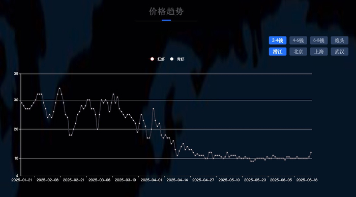 6月20日,潜江市4-6钱的青虾(俗称“中青”)和4-6钱红虾(俗称“中红”)价格为17元一斤,6月中旬跌至13元一斤,而4月的价格则高达37元一斤。