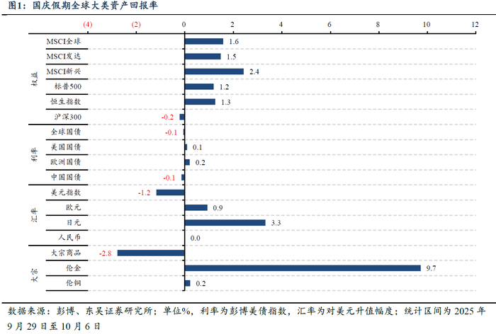 国庆假期前后(9月29日至10月6日),全球大类资产的表现体现为典型的“宽财政+宽货币”组合交易:比特币与黄金为首的大宗商品领涨,全球股市普涨,美债利率震荡,美元指数上涨、欧元与日元下跌。